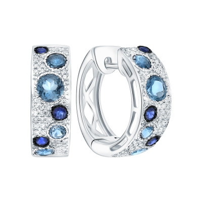 Серьги с 24 бриллиантами природными, 0.09 карат, огранка круг 17 граней, цвет 2, чистота 2, тип огранки А; 64 бриллиантами природными, 0.13 карат, огранка круг 17 граней, цвет 2, чистота 2, тип огранки А; 2 топазами свисс природными, 0.64 карат; 4 топазами свисс природными, 0.5 карат; 2 топазами свисс природными, 0.16 карат; 6 сапфирами природными, 0.24 карат, цвет 2, чистота 2, тип огранки В; Белое золото 585 пробы.