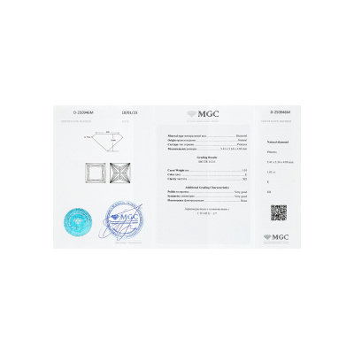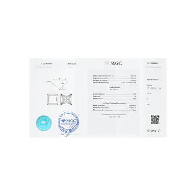 Серьги с 1 бриллиантом природным, 1.01 карат, огранка принцесса 65 граней, цвет 2, чистота 5, тип огранки А; 1 бриллиантом природным, 1.01 карат, огранка принцесса 65 граней, цвет 2, чистота 7, тип огранки А; Белое золото 750 пробы.