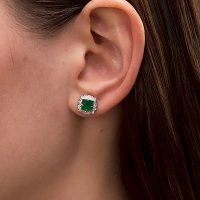 Серьги с 16 бриллиантами природными, 0.15 карат, огранка круг 57 граней, цвет 3, чистота 6, тип огранки А; 24 бриллиантами природными, 0.16 карат, огранка круг 57 граней, цвет 3, чистота 6, тип огранки А; 2 изумрудами природными, 1.4 карат, цвет 3, чистота 3, тип огранки В; Белое золото 585 пробы.