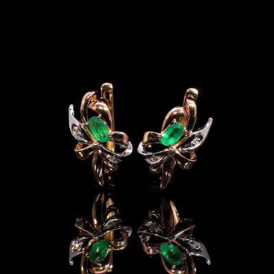 Серьги с 4 бриллиантами природными, 0.01 карат, огранка круг 17 граней, цвет 2, чистота 2, тип огранки А; 2 изумрудами природными, 0.39 карат, цвет 4, чистота 3, тип огранки Б; Розовое золото 585 пробы.