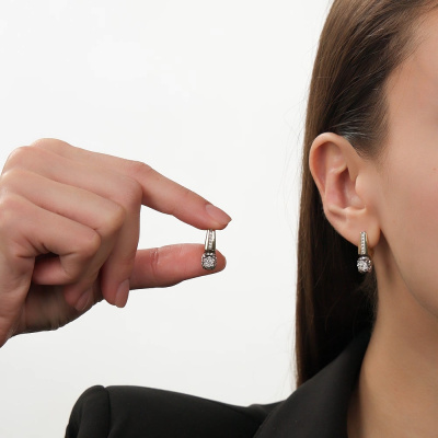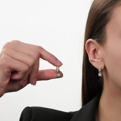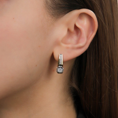 Серьги с 2 бриллиантами природными, 0.07 карат, огранка круг 57 граней, цвет 4, чистота 5, тип огранки А; 12 бриллиантами природными, 0.18 карат, огранка круг 57 граней, цвет 4, чистота 5, тип огранки А; 12 бриллиантами природными, 0.06 карат, огранка круг 57 граней, цвет 4, чистота 5, тип огранки А; Желтое и белое золото 585 пробы.