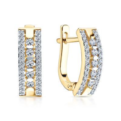 Серьги с 10 бриллиантами природными, 0.22 карат, огранка круг 57 граней, цвет 4, чистота 5, тип огранки А; 48 бриллиантами природными, 0.24 карат, огранка круг 57 граней, цвет 4, чистота 5, тип огранки А; Желтое золото 585 пробы.