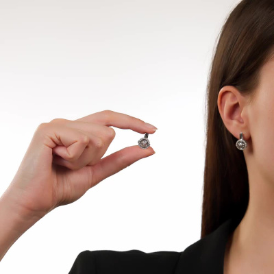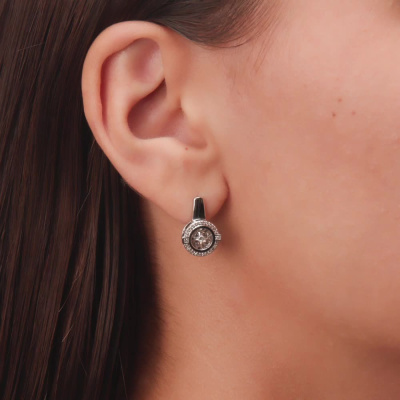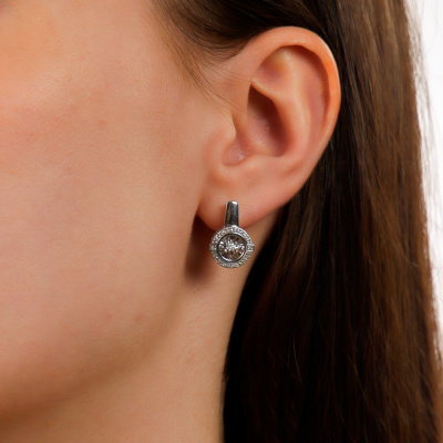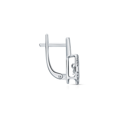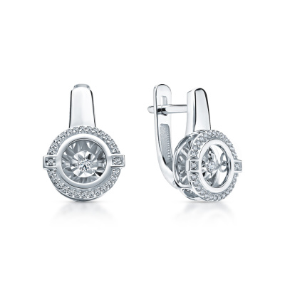 Серьги с 2 бриллиантами природными, 0.04 карат, огранка круг 57 граней, цвет 4, чистота 5, тип огранки А; 56 бриллиантами природными, 0.15 карат, огранка круг 17 граней, цвет 2, чистота 3, тип огранки А; Белое золото 585 пробы.