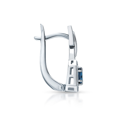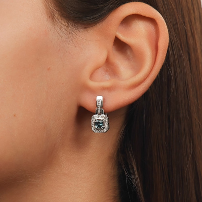Серьги с 40 бриллиантами природными, 0.16 карат, огранка круг 17 граней, цвет 2, чистота 2, тип огранки А; 10 бриллиантами природными, 0.02 карат, огранка круг 17 граней, цвет 2, чистота 2, тип огранки А; 2 топазами лондон природными, 0.82 карат; Белое золото 585 пробы.