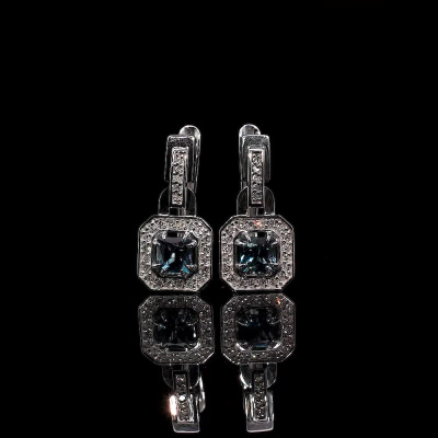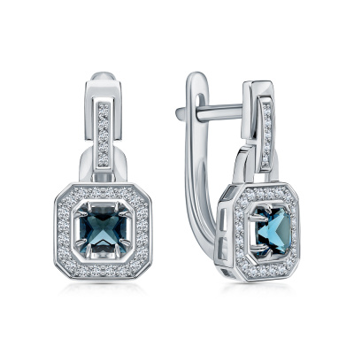Серьги с 40 бриллиантами природными, 0.16 карат, огранка круг 17 граней, цвет 2, чистота 2, тип огранки А; 10 бриллиантами природными, 0.02 карат, огранка круг 17 граней, цвет 2, чистота 2, тип огранки А; 2 топазами лондон природными, 0.81 карат; Белое золото 585 пробы.
