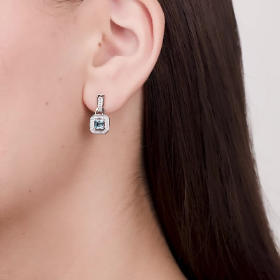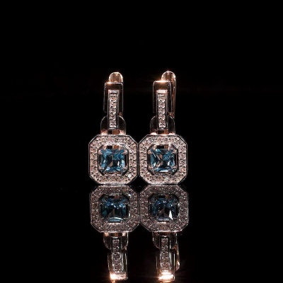 Серьги с 40 бриллиантами природными, 0.16 карат, огранка круг 17 граней, цвет 2, чистота 2, тип огранки А; 10 бриллиантами природными, 0.02 карат, огранка круг 17 граней, цвет 2, чистота 2, тип огранки А; 2 топазами свисс природными, 0.83 карат; Розовое золото 585 пробы.
