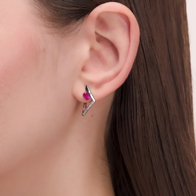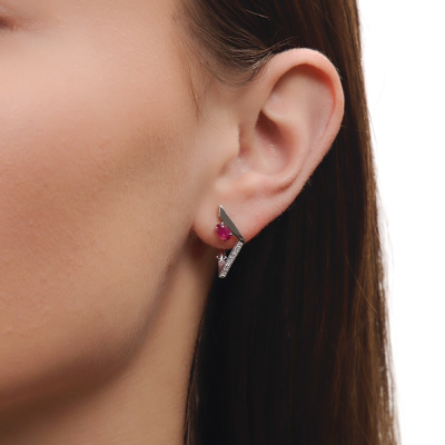 Серьги с 16 бриллиантами природными, 0.05 карат, огранка круг 17 граней, цвет 2, чистота 2, тип огранки А; 2 рубинами природными, 0.45 карат, цвет 2, чистота 2, тип огранки Б; Белое золото 585 пробы.