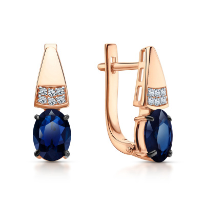Серьги с 12 бриллиантами природными, 0.05 карат, огранка круг 17 граней, цвет 2, чистота 2, тип огранки А; 2 сапфирами синтетическими, 1.8 карат; Розовое золото 585 пробы.