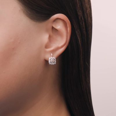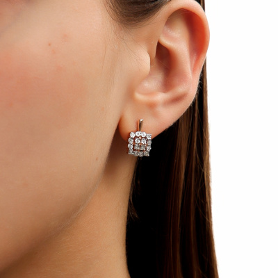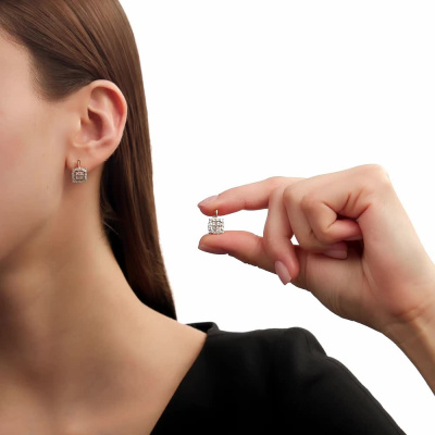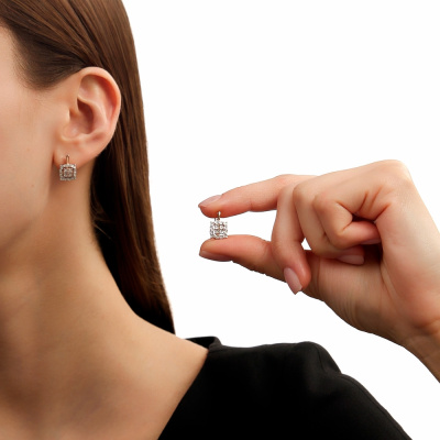 Серьги с 32 бриллиантами природными, 0.08 карат, огранка круг 17 граней, цвет 2, чистота 2, тип огранки А; Розовое и белое золото 585 пробы.