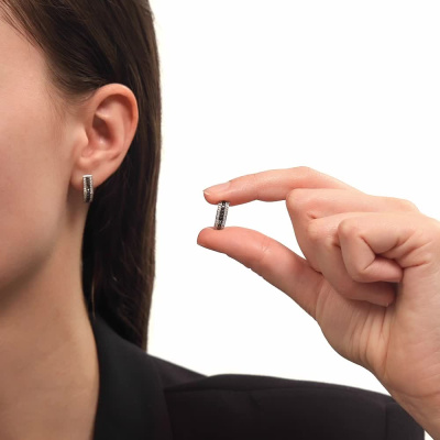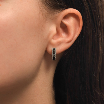 Серьги с 52 бриллиантами природными, 0.14 карат, огранка круг 17 граней, цвет 2, чистота 2, тип огранки А; 18 бриллиантами черными природными облагороженными, 0.16 карат, огранка круг 57 граней, цвет 7, чистота 6, тип огранки А; Белое золото 585 пробы.