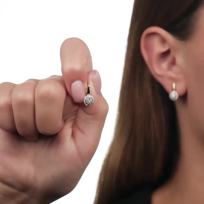 Серьги с 2 бриллиантами природными, 0.02 карат, огранка круг 57 граней, цвет 4, чистота 6; 12 бриллиантами природными, 0.06 карат, огранка круг 57 граней, цвет 4, чистота 6; 44 бриллиантами природными, 0.09 карат, огранка круг 17 граней, цвет 2, чистота 2; Розовое золото 585 пробы.