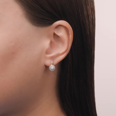 Серьги с 2 бриллиантами природными, 0.02 карат, огранка круг 57 граней, цвет 4, чистота 6, тип огранки А; 12 бриллиантами природными, 0.07 карат, огранка круг 57 граней, цвет 4, чистота 6, тип огранки А; 44 бриллиантами природными, 0.09 карат, огранка круг 17 граней, цвет 2, чистота 2, тип огранки А; Розовое золото 585 пробы.