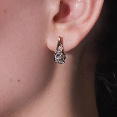 Серьги с 2 бриллиантами природными, 0.06 карат, огранка круг 57 граней, цвет 3, чистота 6; 6 бриллиантами природными, 0.04 карат, огранка круг 57 граней, цвет 3, чистота 6; 32 бриллиантами природными, 0.13 карат, огранка круг 17 граней, цвет 2, чистота 2; Розовое и белое золото 585 пробы.