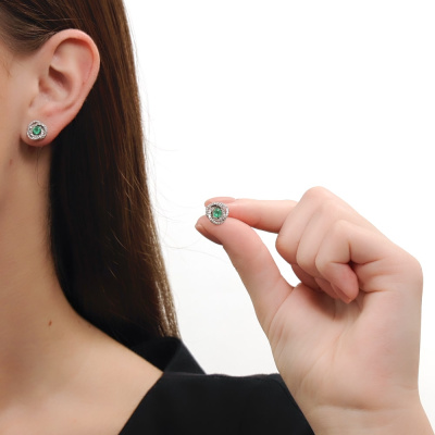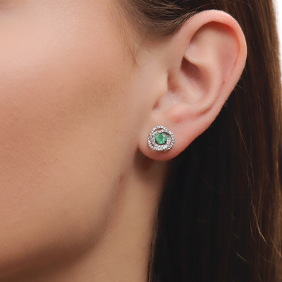 Серьги с 84 бриллиантами природными, 0.17 карат, огранка круг 17 граней, цвет 2, чистота 2, тип огранки А; 2 изумрудами природными, 0.45 карат, цвет 3, чистота 3, тип огранки В; Белое золото 585 пробы.