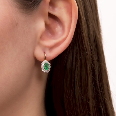 Серьги с 84 бриллиантами природными, 0.34 карат, огранка круг 17 граней, цвет 2, чистота 2, тип огранки А; 2 изумрудами природными, 0.75 карат, цвет 3, чистота 3, тип огранки Б; Розовое золото 585 пробы.