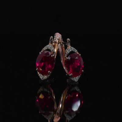 Серьги с 4 бриллиантами природными, 0.03 карат, огранка круг 57 граней, цвет 3, чистота 6; 8 бриллиантами природными, 0.01 карат, огранка круг 17 граней, цвет 2, чистота 2; 2 рубинами синтетическими, 4.32 карат; Розовое золото 585 пробы.