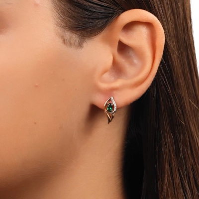 Серьги с 10 бриллиантами природными, 0.04 карат, огранка круг 17 граней, цвет 2, чистота 2; 2 гидротермальными изумрудами, 0.43 карат; Розовое золото 585 пробы.