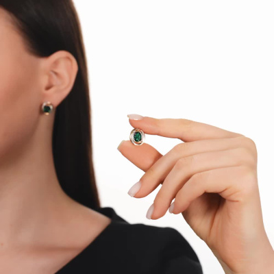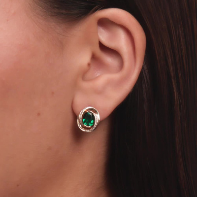 Серьги с 8 бриллиантами природными, 0.06 карат, огранка круг 17 граней, цвет 2, чистота 2, тип огранки А; 16 бриллиантами природными, 0.07 карат, огранка круг 17 граней, цвет 2, чистота 2, тип огранки А; 8 бриллиантами природными, 0.02 карат, огранка круг 17 граней, цвет 2, чистота 2, тип огранки А; 2 гидротермальными изумрудами, 2.03 карат; Розовое золото 585 пробы.