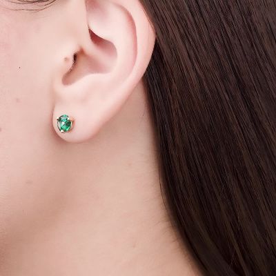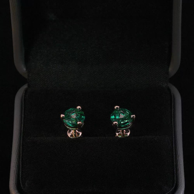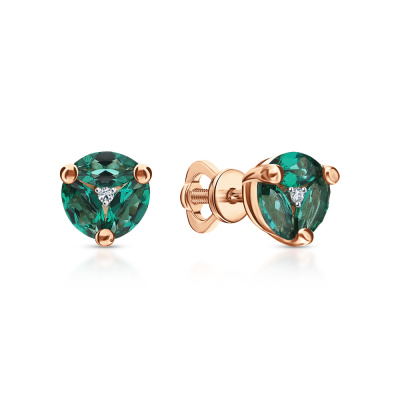 Серьги с 2 бриллиантами природными, 0.008 карат, огранка круг 17 граней, цвет 2, чистота 2, тип огранки А; 6 гидротермальными изумрудами, 0.76 карат; Розовое золото 585 пробы.