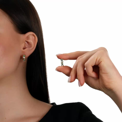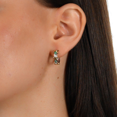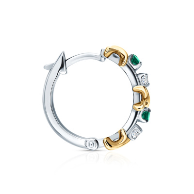 Серьги с 4 бриллиантами природными, 0.13 карат, огранка круг 57 граней, цвет 3, чистота 6, тип огранки А; 4 изумрудами природными, 0.1 карат, цвет 3, чистота 3, тип огранки В; Желтое и белое золото 585 пробы.