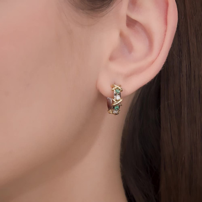Серьги с 4 бриллиантами природными, 0.13 карат, огранка круг 57 граней, цвет 3, чистота 6, тип огранки А; 4 изумрудами природными, 0.11 карат, цвет 3, чистота 3, тип огранки В; Желтое и белое золото 585 пробы.