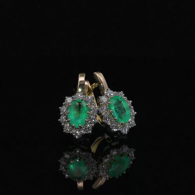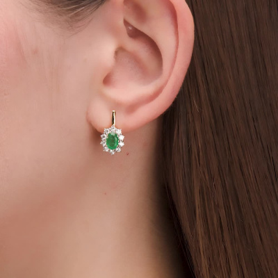 Серьги с 20 бриллиантами природными, 0.73 карат, огранка круг 57 граней, цвет 3, чистота 6, тип огранки А; 2 изумрудами природными, 1.33 карат, цвет 3, чистота 3, тип огранки Б; Желтое золото 585 пробы.