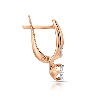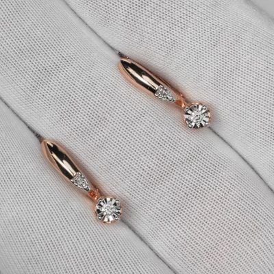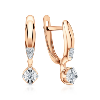Серьги с 2 бриллиантами природными, 0.06 карат, огранка круг 57 граней, цвет 3, чистота 6; 2 бриллиантами природными, 0.009 карат, огранка круг 17 граней, цвет 2, чистота 2; Розовое и белое золото 585 пробы.