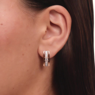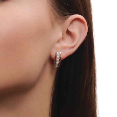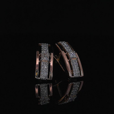 Серьги с 2 бриллиантами природными, 0.35 карат, огранка принцесса 65 граней, цвет 3, чистота 5, тип огранки А; 40 бриллиантами природными, 0.27 карат, огранка круг 57 граней, цвет 3, чистота 6, тип огранки А; Розовое золото 585 пробы.