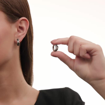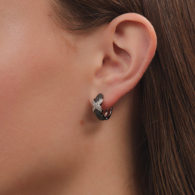 Серьги с 68 бриллиантами природными, 0.14 карат, огранка круг 17 граней, цвет 2, чистота 2, тип огранки А; 166 бриллиантами черными природными облагороженными, 0.42 карат, огранка круг 57 граней, цвет 7, чистота 6, тип огранки А; Белое золото 585 пробы.