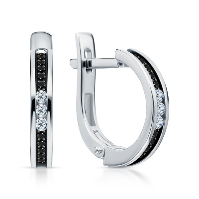 Серьги с 6 бриллиантами природными, 0.09 карат, огранка круг 57 граней, цвет 3, чистота 5, тип огранки А; 24 бриллиантами черными природными облагороженными, 0.13 карат, огранка круг 57 граней, цвет 7, чистота 6, тип огранки А; Белое золото 585 пробы.