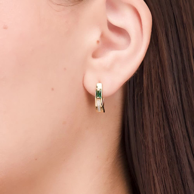Серьги с 10 бриллиантами природными, 0.04 карат, огранка круг 17 граней, цвет 2, чистота 2, тип огранки А; 2 гидротермальными изумрудами, 0.41 карат; Желтое золото 585 пробы.