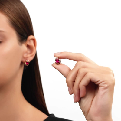 Серьги с 20 бриллиантами природными, 0.09 карат, огранка круг 17 граней, цвет 2, чистота 2, тип огранки А; 2 рубинами синтетическими, 2.81 карат; Розовое золото 585 пробы.