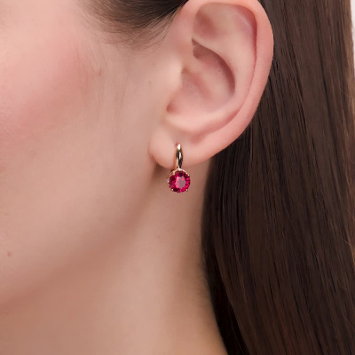 Серьги с 8 бриллиантами природными, 0.06 карат, огранка круг 17 граней, цвет 2, чистота 2, тип огранки А; 2 рубинами синтетическими, 3.16 карат; Розовое золото 585 пробы.