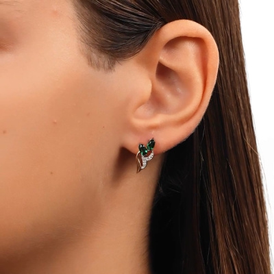 Серьги с 6 бриллиантами природными, 0.02 карат, огранка круг 17 граней, цвет 2, чистота 2; 4 гидротермальными изумрудами, 0.73 карат; Розовое золото 585 пробы.