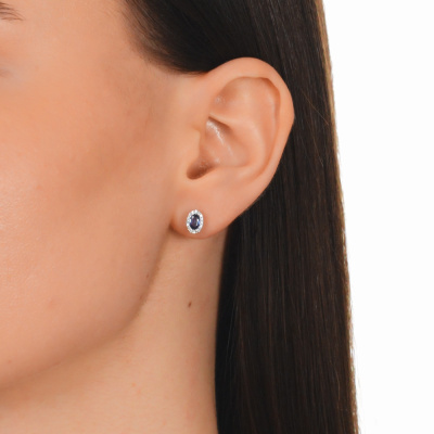 Серьги с 32 бриллиантами природными, 0.09 карат, огранка круг 17 граней, цвет 2, чистота 3, тип огранки Б; 2 сапфирами природными, 0.57 карат, цвет 3, чистота 4, тип огранки Б; Белое золото 585 пробы.