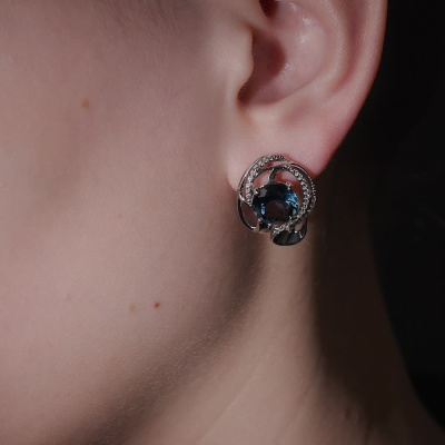 Серьги с 62 бриллиантами природными, 0.32 карат, огранка круг 57 граней, цвет 3, чистота 5, тип огранки А; 2 топазами лондон природными, 8.42 карат; Белое золото 585 пробы.