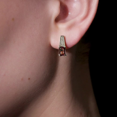 Серьги с 6 бриллиантами природными, 0.05 карат, огранка круг 57 граней, цвет 3, чистота 5, тип огранки А; 10 бриллиантами природными, 0.04 карат, огранка круг 57 граней, цвет 3, чистота 5, тип огранки А; 2 турмалинами розовыми природными, 1.85 карат, тип огранки А; Желтое золото 585 пробы.