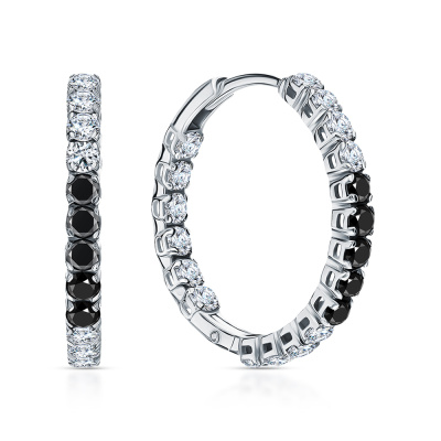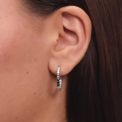 Серьги с 28 бриллиантами природными, 1.06 карат, огранка круг 57 граней, цвет 3, чистота 6, тип огранки А; 10 бриллиантами черными природными облагороженными, 0.43 карат, огранка круг 57 граней, цвет 7, чистота 6, тип огранки А; Белое золото 585 пробы.