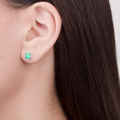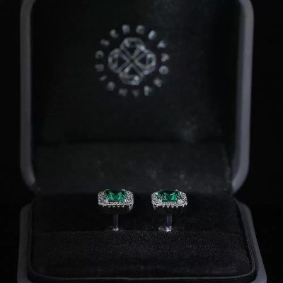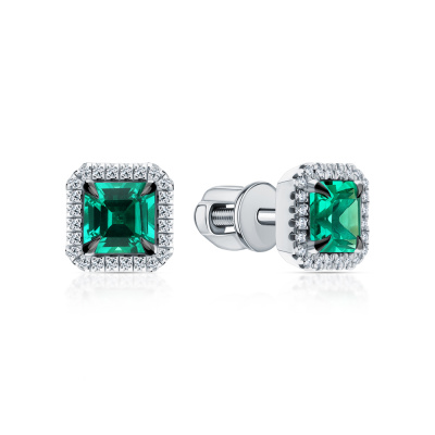 Серьги с 48 бриллиантами природными, 0.12 карат, огранка круг 17 граней, цвет 2, чистота 2, тип огранки А; 2 изумрудами выращенными Колумбия, 0.9 карат; Белое золото 585 пробы.