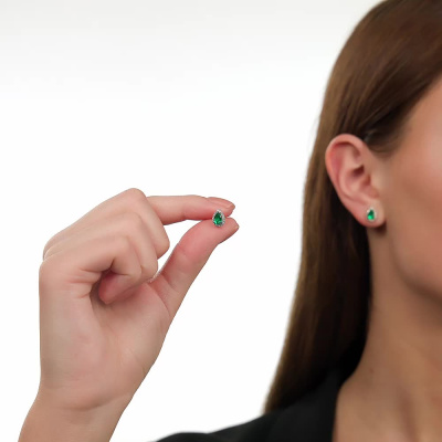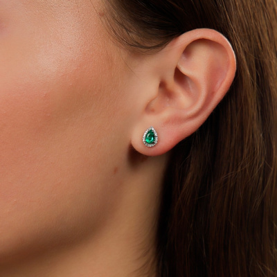 Серьги с 44 бриллиантами природными, 0.09 карат, огранка круг 17 граней, цвет 2, чистота 2, тип огранки А; 2 гидротермальными изумрудами, 0.73 карат; Белое золото 585 пробы.