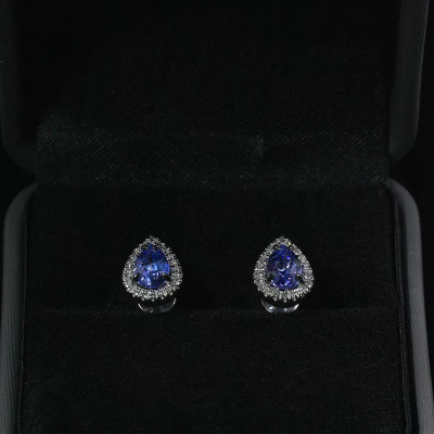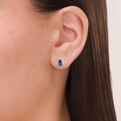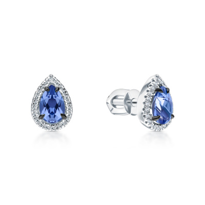 Серьги с 44 бриллиантами природными, 0.09 карат, огранка круг 17 граней, цвет 2, чистота 2, тип огранки А; 2 сапфирами синт. Чохр., 1.15 карат; Белое золото 585 пробы.