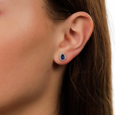 Серьги с 44 бриллиантами природными, 0.09 карат, огранка круг 17 граней, цвет 2, чистота 2, тип огранки А; 2 сапфирами синт. Чохр., 1.03 карат; Белое золото 585 пробы.