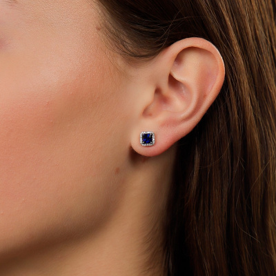 Серьги с 48 бриллиантами природными, 0.11 карат, огранка круг 17 граней, цвет 2, чистота 2, тип огранки А; 2 сапфирами синтетическими, 1.15 карат; Белое золото 585 пробы.