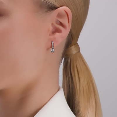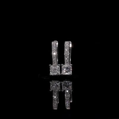 Серьги с 1 бриллиантом природным, 0.5 карат, огранка принцесса 65 граней, цвет 2, чистота 4, тип огранки А; 1 бриллиантом природным, 0.5 карат, огранка принцесса 65 граней, цвет 2, чистота 5, тип огранки А; 14 бриллиантами природными, 0.11 карат, огранка круг 57 граней, цвет 3, чистота 6, тип огранки А; Белое золото 585 пробы.