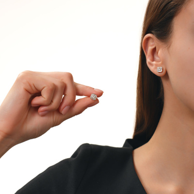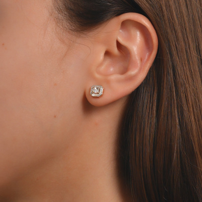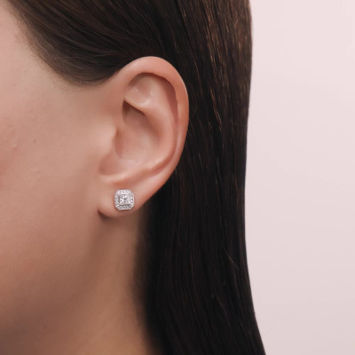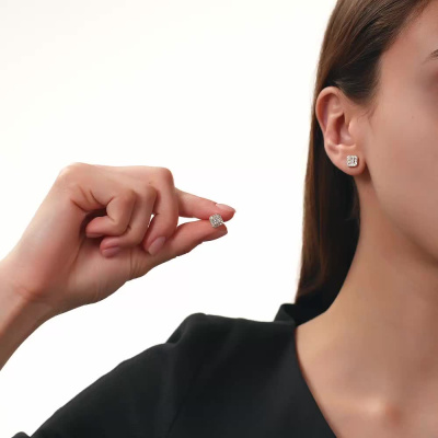 Серьги с 2 бриллиантами природными, 0.47 карат, огранка принцесса 65 граней, цвет 3, чистота 6, тип огранки А; 32 бриллиантами природными, 0.13 карат, огранка круг 17 граней, цвет 2, чистота 2, тип огранки А; Розовое золото 585 пробы.