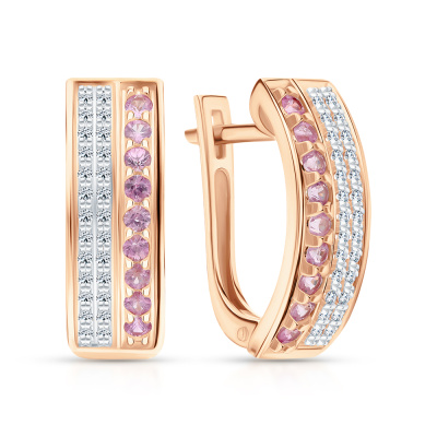 Серьги с 52 бриллиантами природными, 0.11 карат, огранка круг 17 граней, цвет 2, чистота 2, тип огранки А; 18 сапфирами розовыми природными, 0.31 карат, тип огранки В; Розовое золото 585 пробы.