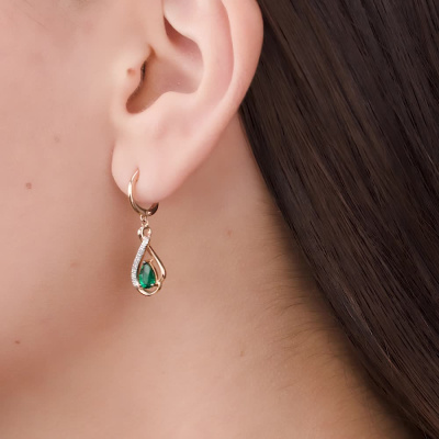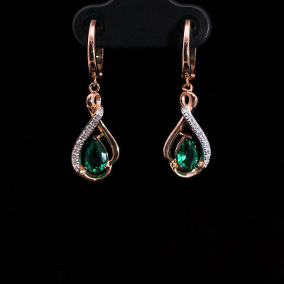 Серьги с 22 бриллиантами природными, 0.05 карат, огранка круг 17 граней, цвет 2, чистота 2, тип огранки А; 4 бриллиантами природными, 0.008 карат, огранка круг 17 граней, цвет 2, чистота 2, тип огранки А; 2 гидротермальными изумрудами, 0.66 карат, тип огранки Б; Розовое золото 585 пробы.
