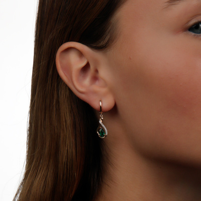 Серьги с 22 бриллиантами природными, 0.06 карат, огранка круг 17 граней, цвет 2, чистота 2, тип огранки А; 4 бриллиантами природными, 0.008 карат, огранка круг 17 граней, цвет 2, чистота 2, тип огранки А; 2 гидротермальными изумрудами, 0.68 карат; Розовое золото 585 пробы.