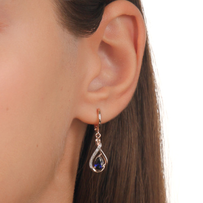 Серьги с 22 бриллиантами природными, 0.06 карат, огранка круг 17 граней, цвет 2, чистота 2, тип огранки А; 4 бриллиантами природными, 0.007 карат, огранка круг 17 граней, цвет 2, чистота 2, тип огранки А; 2 сапфирами синтетическими, 0.93 карат; Розовое золото 585 пробы.