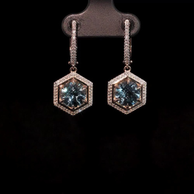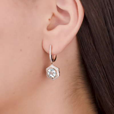 Серьги с 116 бриллиантами природными, 0.24 карат, огранка круг 17 граней, цвет 2, чистота 2, тип огранки А; 2 топазами скай природными, 4.43 карат, огранка круг чекер; Розовое золото 585 пробы.